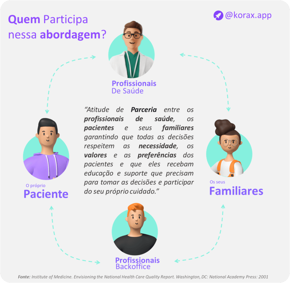Nessa abordagem o paciente, familiares, profissionais de Saúde e os de backoffice são protagonistas na abordagem de cuidado centrado na pessoa. Indo além da equipe assistência como técnicos, enfermeiros, terapeutas e médicos. Mas o cuidado centrado no paciente também envolve os comportamentos dos Profissionais de Backoffice como os agentes de portaria, recepcionistas, estagiários, membros das equipes administrativas e todos que fazem parte da instituição de saúde.